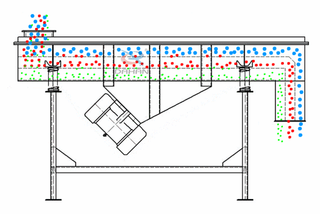 原理是利用振動(dòng)電機(jī)激振器作為振動(dòng)源,使物料在篩網(wǎng)上被拋起,同時(shí)向前作直線運(yùn)動(dòng),物料從給料機(jī)均勻地進(jìn)入篩分機(jī)的進(jìn)料口,通過(guò)多層篩網(wǎng)產(chǎn)生數(shù)種規(guī)格的篩上物、篩下物、分別從各自的出口排出。