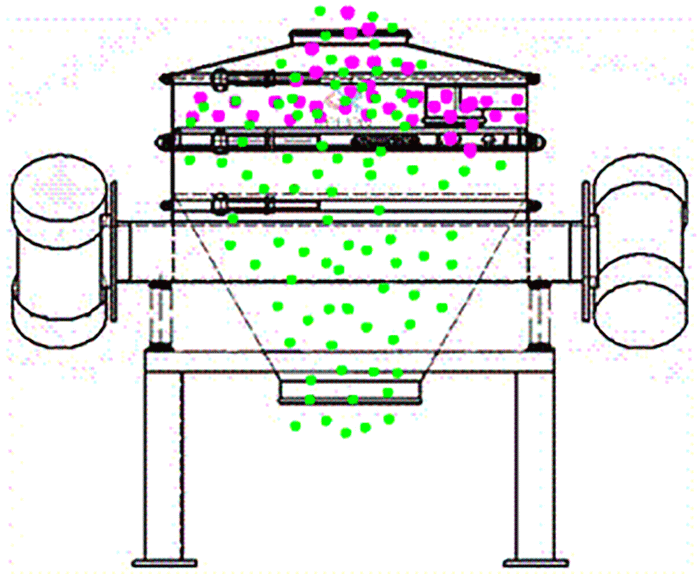 直排篩的原理是通過振動源的作用使物料在篩面做三維運動,這種運動方式可以使結(jié)塊物料散開,快速的通過篩網(wǎng)。精細物料直接由下部排出,雜物粗料則通過排渣出料口排出。