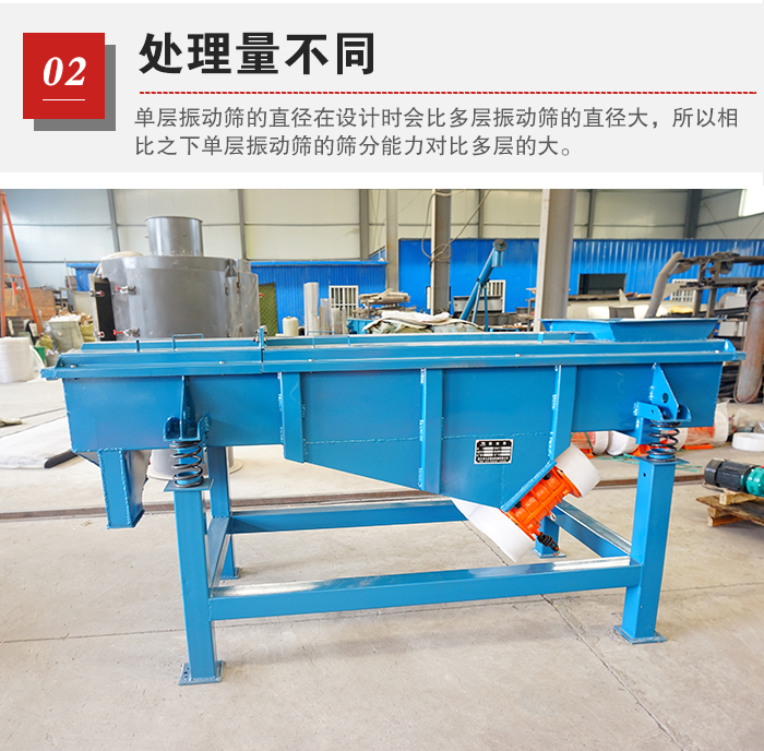 物料篩分產(chǎn)量是由篩網(wǎng)的直徑,也就是物料與篩網(wǎng)的接觸面積有直接關系的。而單層振動篩的直徑在設計時會比多層振動篩的直徑大,所以相比之下單層振動篩的篩分能力對比多層的大。