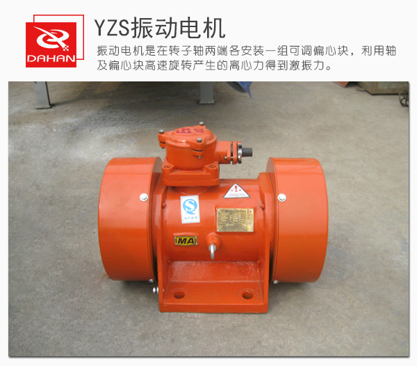 YZS振動電機(jī)是動力源與振動源結(jié)合為一體的激振源,振動電機(jī)是在轉(zhuǎn)子軸兩端各安裝一組可調(diào)偏心塊,利用軸及偏心塊高速旋轉(zhuǎn)產(chǎn)生的離心力得到激振力。