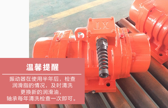 4、大漢機(jī)械溫馨提醒:振動(dòng)器在使用半年后,檢查潤(rùn)滑脂的情況,如發(fā)現(xiàn)變干或者有硬塊時(shí),及時(shí)清洗更換新的潤(rùn)滑油,軸承每年清洗檢查一次即可。
